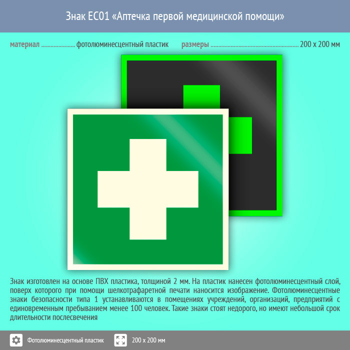 Знак EC01 «Аптечка первой медицинской помощи» (фотолюминесцентный пластик, 200х200 мм) в Лобне купить