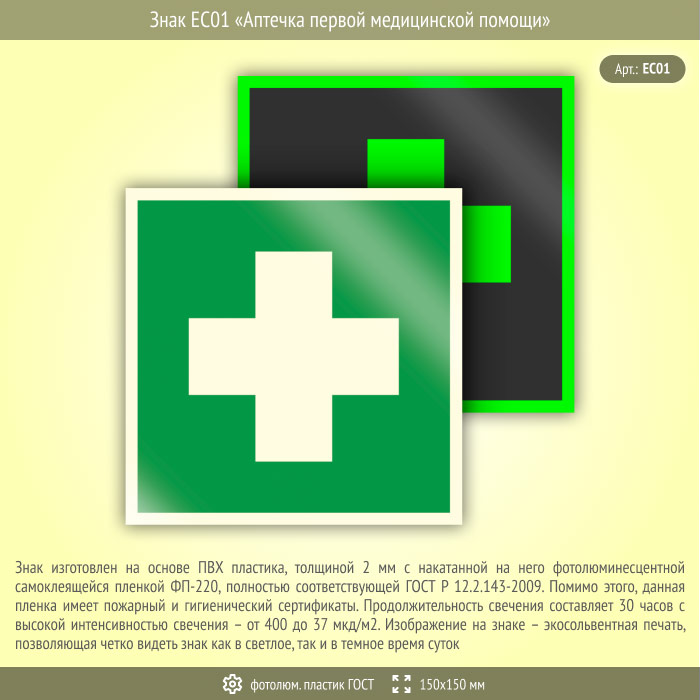 Знак EC01 «Аптечка первой медицинской помощи» (фотолюминесцентный пластик ГОСТ 34428-2018, 150х150 мм) в Лобне купить