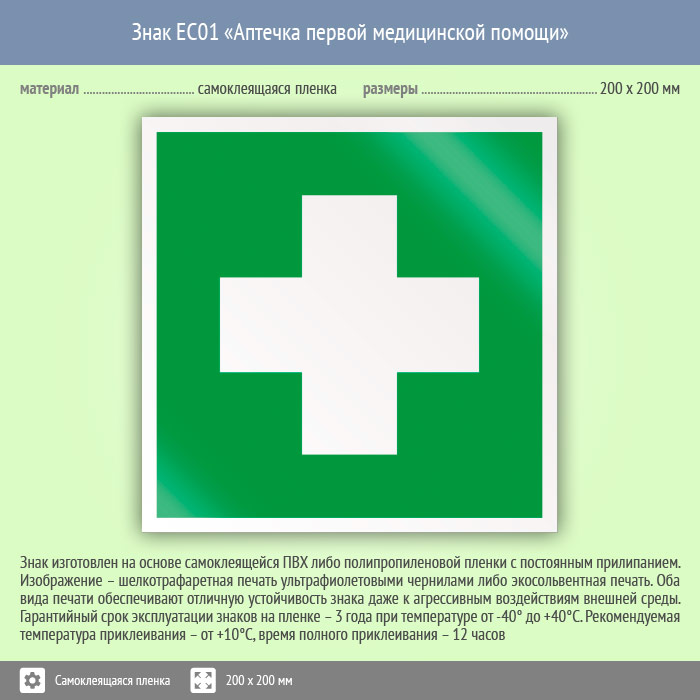 Знак EC01 «Аптечка первой медицинской помощи» (пленка, 200х200 мм) в Лобне купить