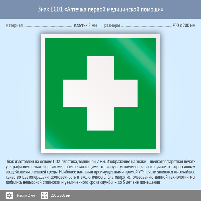 Знак EC01 «Аптечка первой медицинской помощи» (пластик, 200х200 мм) в Лобне купить