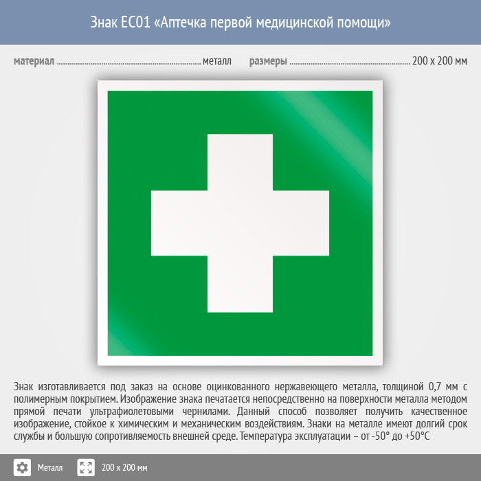 Знак EC01 «Аптечка первой медицинской помощи» (металл, 200х200 мм) в Лобне купить
