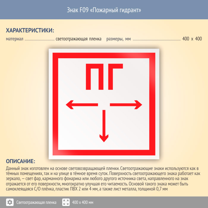 Знак F09 «Пожарный гидрант» (светоотражающая пленка, 400х400 мм) в Лобне купить
