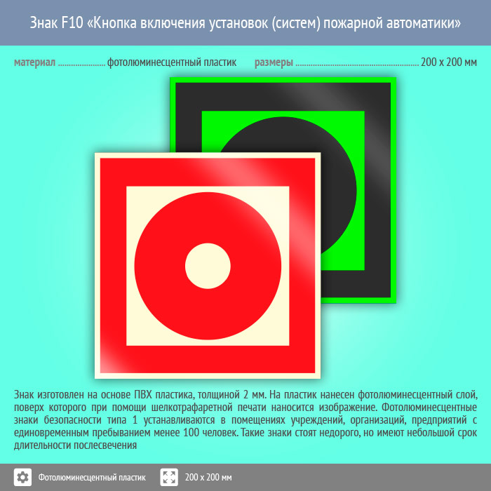 Знак F10 «Кнопка включения установок (систем) пожарной автоматики» (фотолюминесцентный пластик, 200х200 мм) в Лобне купить