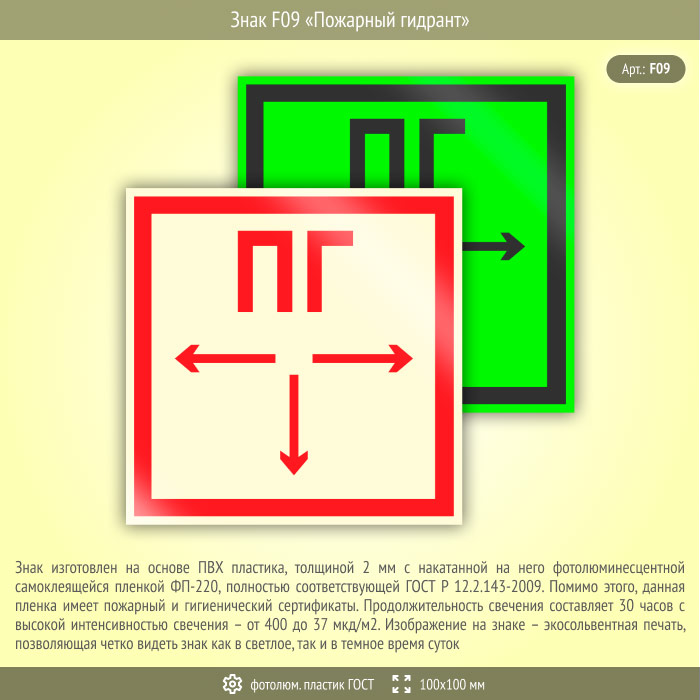 Знак F09 «Пожарный гидрант» (фотолюминесцентный пластик ГОСТ 34428-2018, 100х100 мм) в Лобне купить