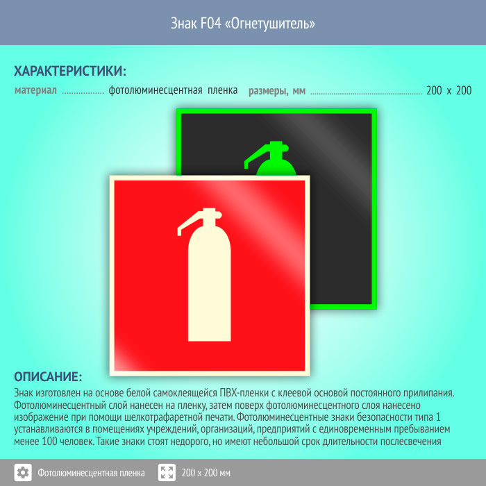 Знак F04 «Огнетушитель» (фотолюминесцентная пленка, 200х200 мм) в Лобне купить