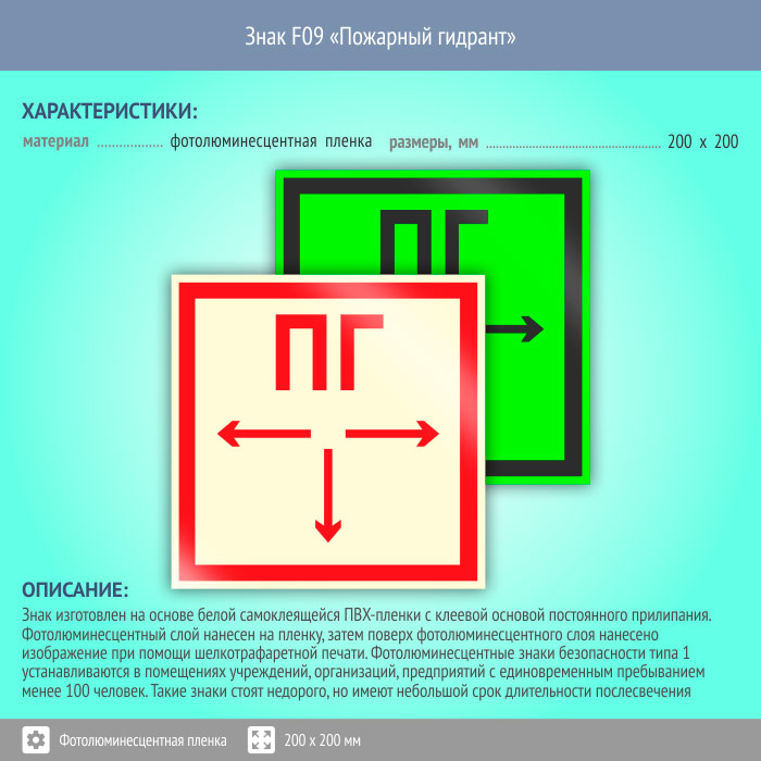Знак F09 «Пожарный гидрант» (фотолюминесцентная пленка, 200х200 мм) в Лобне купить