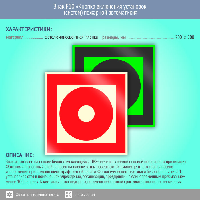 Знак F10 «Кнопка включения установок (систем) пожарной автоматики» (фотолюминесцентная пленка, 200х200 мм) в Лобне купить