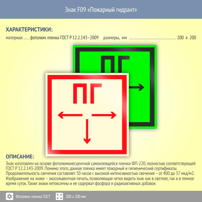 Знак F09 «Пожарный гидрант» (фотолюминесцентная пленка ГОСТ 34428-2018, 200х200 мм) в Лобне купить