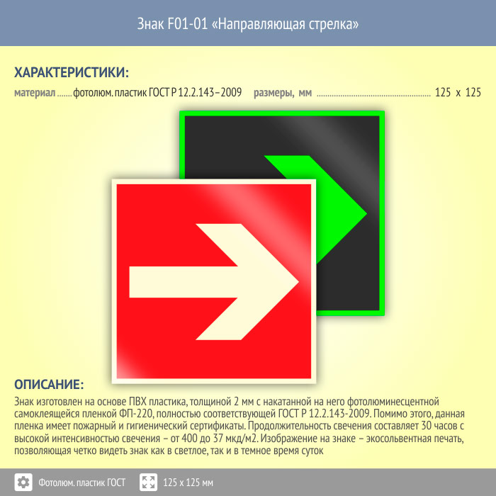 Знак F01-01 «Направляющая стрелка» (фотолюминесцентный пластик ГОСТ 34428-2018, 125х125 мм) в Лобне купить