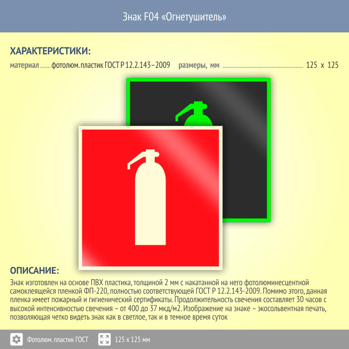 Знак F04 «Огнетушитель» (фотолюминесцентный пластик ГОСТ 34428-2018, 125х125 мм) в Лобне купить
